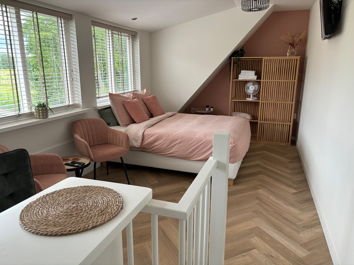 Et atelier forvandlet til en grøn fugleatmosfære i vores have med privat terrasse inden for gåafstand fra skov og bymidte. Studiet er et dejligt rum, hvor du finder en stue (digitalt tv med Netflix og YouTube), soveværelse og køkken + separat bruser og toilet. Køkkenet er fuldt udstyret, fra køleskab, kombi-mikrobølgeovn, komfur + (bønne) kaffemaskine med cappuccino mulighed. Du vil sove i en dejlig dobbelt boxspring (eller 2 enkeltsenge) Alle ingredienserne til et vidunderligt ophold i Schoorls