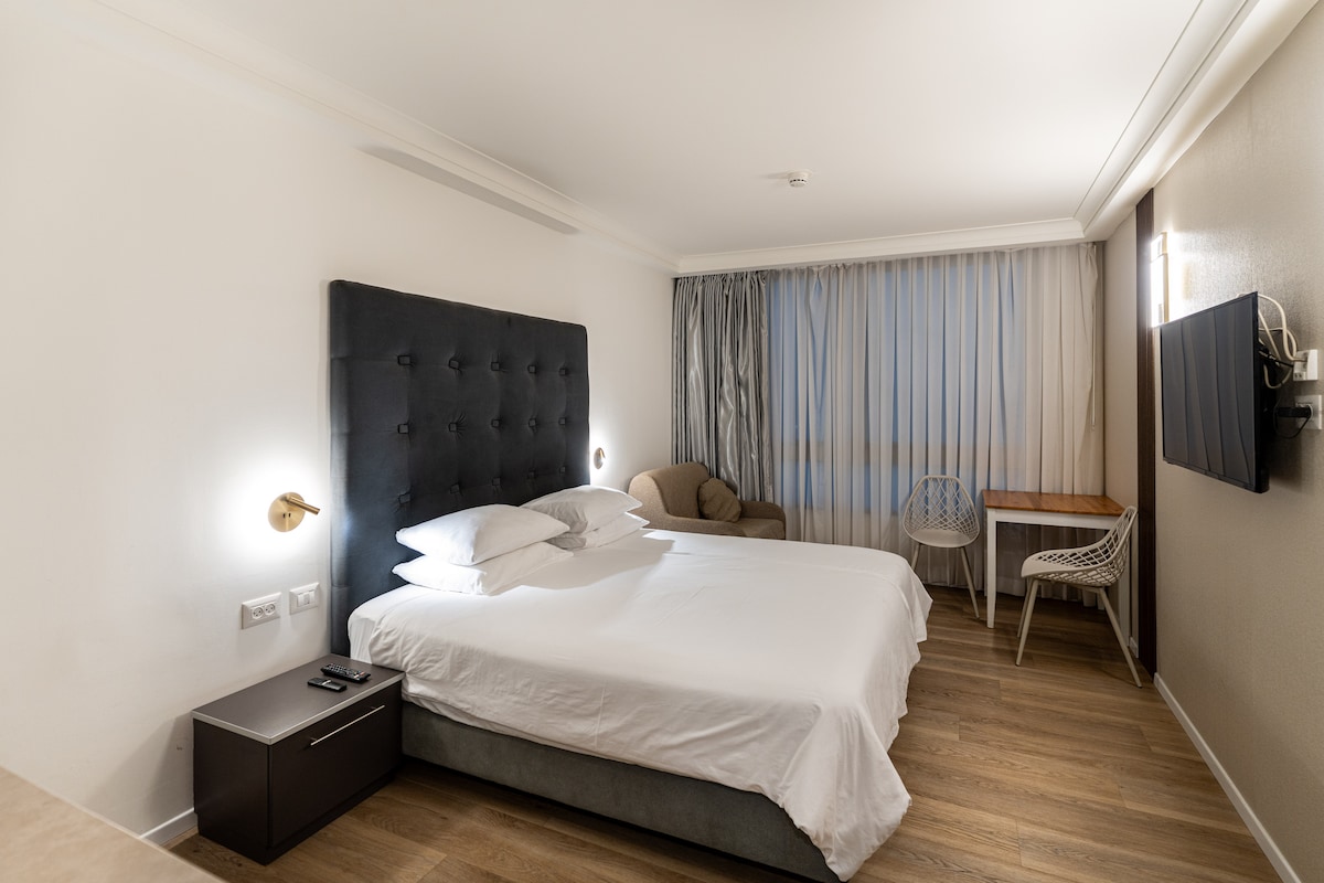 Supernyt studio i centrum på Kikar-torget, 3 minutters gang fra elevatoren til havet. Lejligheden ligger på anden sal uden elevator og er udstyret med alt, hvad du behøver for et behageligt ophold og afslapning. Gåafstand til alt. Prisen inkluderer alt udstyr samt sengetøj og håndklæder. Vi er klar til at rådgive og hjælpe i enhver sag med et personligt præg.