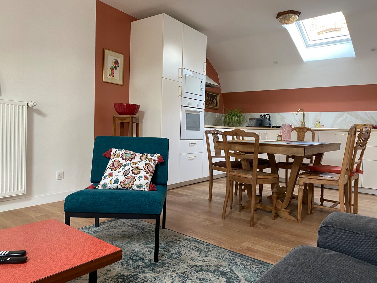 En elegant bolig på 35 m2 i centrum af Yssingeaux, tæt på restauranter, teater, biograf og butikker. 10 minutters gang fra Ducasse-skolen. Wi-fi. Håndklæder og sengetøj er inkluderet. Lille køleskab, ovn, mikrobølgeovn, induktionskogeplader, kaffemaskine, tekande, brødrister, opvaskemaskine, garderobe, kommode, tv, strygejern, støvsuger, spil... Nye faciliteter. I karakterbygning. Gratis parkering i nærheden.