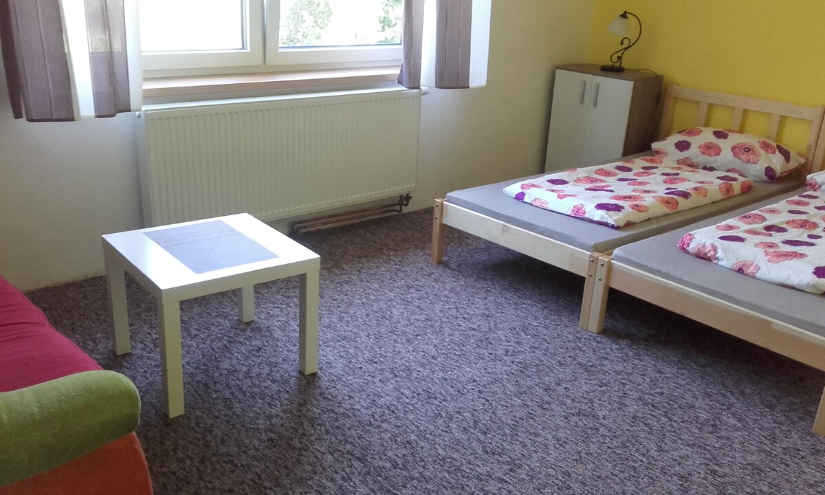 Accomodation in a family house (down stair - 1.floor) almost in the secluded area next to the wood. Upper floor in undergoing reconstruction. Accomodation offers 8 beds, around the house is a garden with seating and barbecue. Possibility of storing bicycles and skis. wellness - hot tube Surroundings: Pond Janus (2km), River Pond (5km), cycling, hiking, cross-country, skiing (Hlinsko Ski Resort), wellnes (Hotel Styl Hlinsko - 7 km), Veselý kopec, Peklo Čertovina, Doubravka and many others
