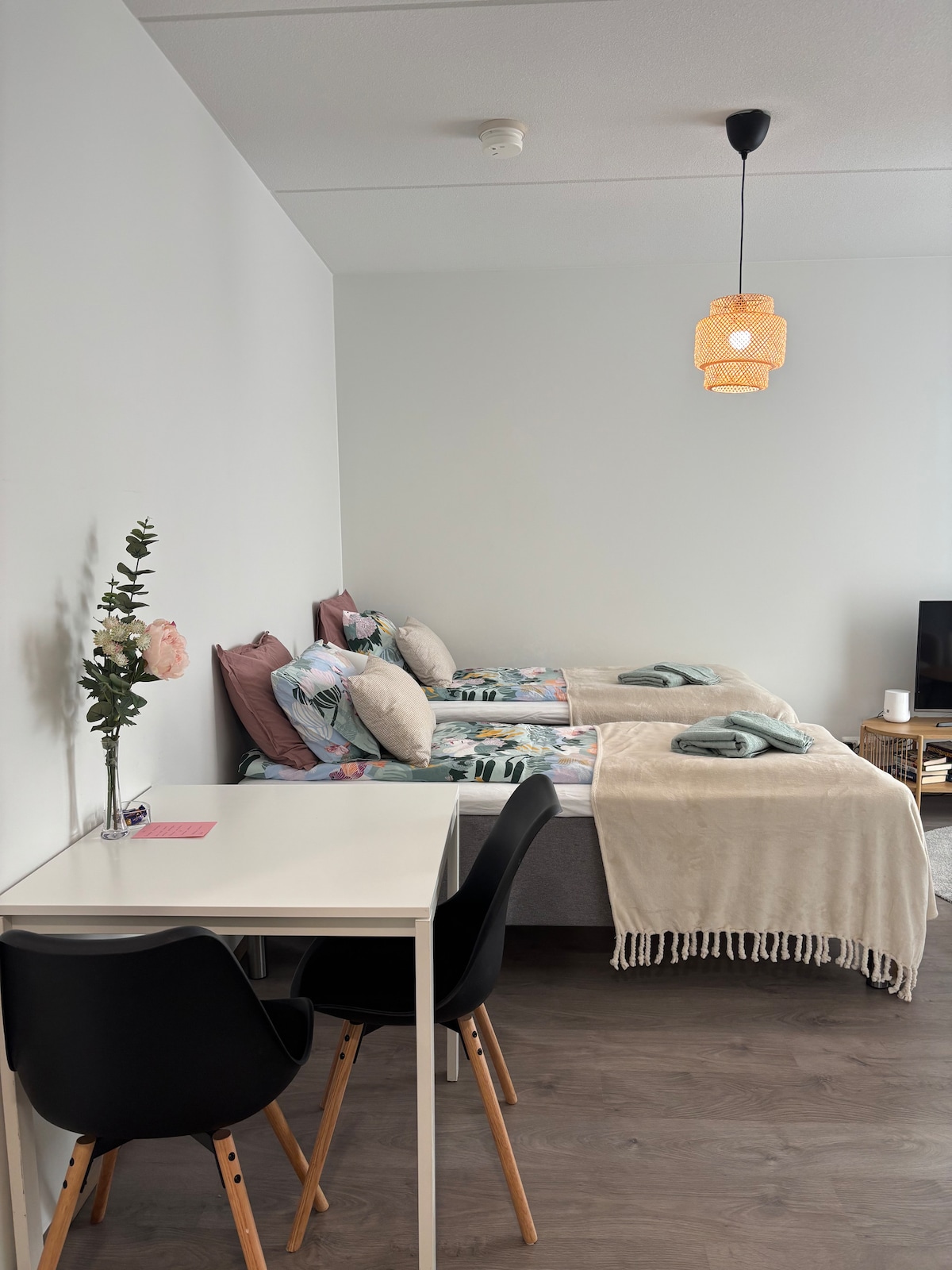 Velkommen til Joutsan Joutiinen, en fredelig ferielandsby midt i naturen! Træd ind i en verden af vores renoverede byhus, der åbner op til den dejlige skovklædte udsigt over Puttolanselä. I Swan Pond-området kan du ikke kun nyde godt udendørs terræn, men også en fantastisk, lavvandet sandstrand, et hyggeligt grillområde samt to tennisbaner. Vores studie er hyggeligt og udstyret med alle de grundlæggende faciliteter. Takket være de store vinduer åbner det smukke landskab direkte ind i lejligheden.