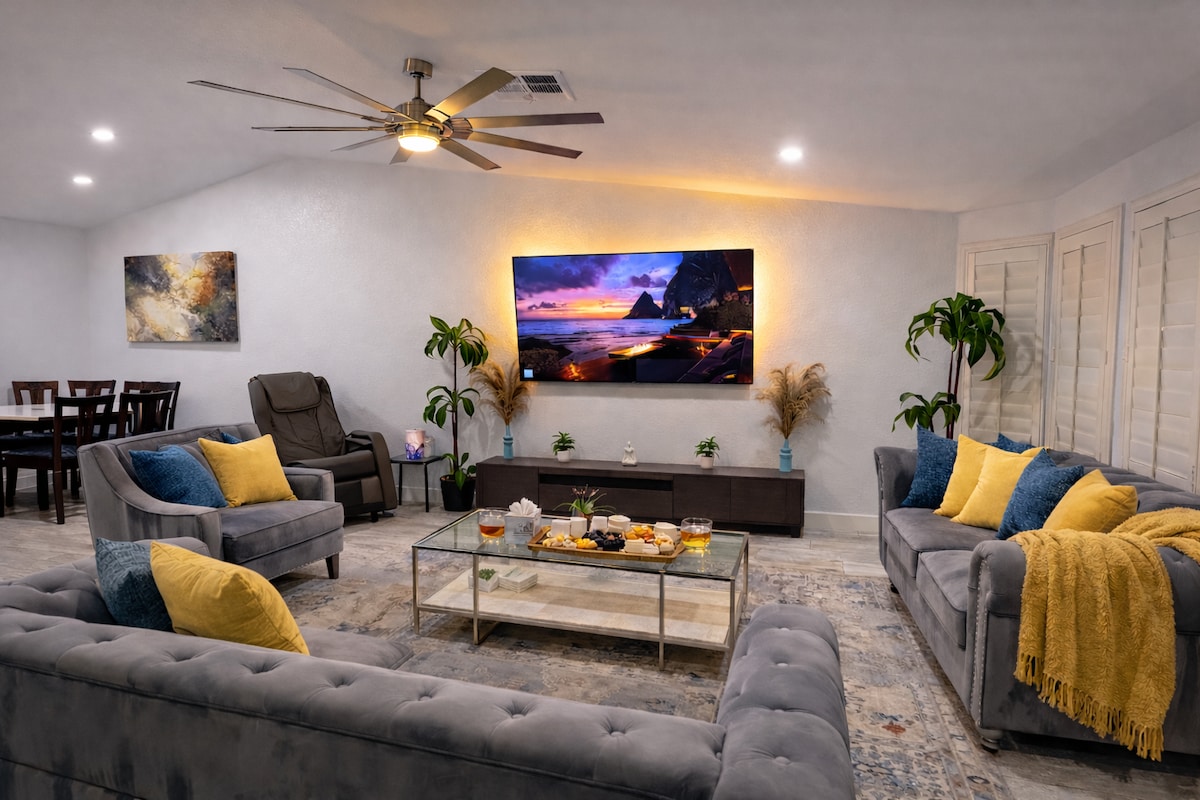 Velkommen til vores moderne, smarte drømmebolig, der er perfekt til familier med børn, par eller gruppeferier! Vores nyrenoverede hus med 4 soveværelser og 3 badeværelser har alt, hvad du behøver for et behageligt og stilfuldt ophold. Slap af ved den helt nye moderne pool, eller tag en kort køretur til Lake Mead og Lake Las Vegas for at få lidt udendørs sjov. Vores hus ligger kun 15 minutter fra Las Vegas Strip og 13 minutter fra lufthavnen, og det ligger tæt på indkøbscentre, golfklubber, markeder og lokale restauranter.