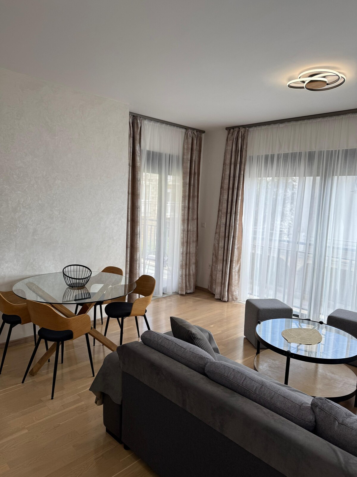 Moderne lejlighed på 40 m2 med terrasse, hvorfra der er udsigt over havet. Lejligheden ligger i komplekset Green Park 3. Bygningen har en sæsonbestemt swimmingpool fra juni til september. Lejligheden er udstyret med et komplet køkken, gratis wi-fi, tv. Lejligheden har en spiseplads med bord. Der er mulighed for parkering foran bygningen, afhængigt af tilgængelighed. Den nærmeste strand ligger 5 minutters gang væk, med restauranter og strandbarer. Afstanden fra One&Only Resort Porto Novi er 3,4 km.