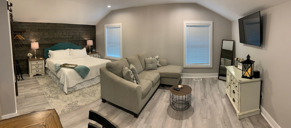 Beliggenhed, beliggenhed, beliggenhed! Suiterne på 3. ligger lige midt i det charmerende centrum Hermann. Gå hen til de steder, du gerne vil. Tager du Amtrak ind til byen? Vi er kun et par blokke væk. Dette opslag er for Suite 1 og har 1 soveværelse og 1 badeværelse. Roku TV, så du kan logge på din foretrukne streamingtjeneste (ingen kabel-tv) Send mig en besked for at få oplysninger om, hvordan du booker mere end én suite. Vi har i alt 5 suiter med i alt 8 soveværelser. Nem indtjekning uden kontakt!