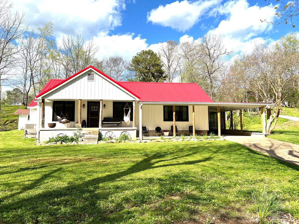 Dette perfekte gemmested har en luksuriøs himmelseng, elegant pejs og komplet køkken, der alle er skjult i en rød lade på 180 hektar. Nyd vand fra vores private kilde, udforsk bækken, gå gennem træer og afsides marker, se hjorte og kalkuner, kig efter Moonshine Hollow, hvor en "hævn" blev skudt under forbuddet, få kaffe på terrassen, steg skumfiduser, besøg torvet , gennemse maleriske butikker, tag et billede med Minnie Pearl & prøv fantastisk lokal is. Vi ville elske at have dig!