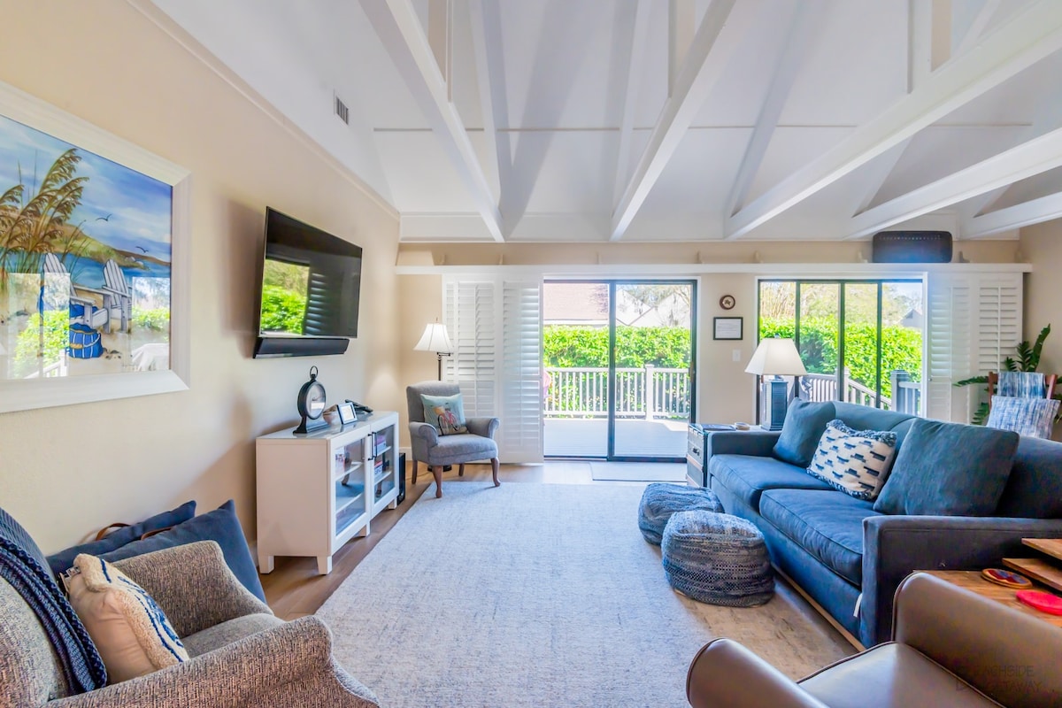 ✨Top 10 % gæstefavorit✨ Gated Beachfront Resort: Golf, Tennis, Pickleball, Pool, Restauranter og barer! Smuk solrig villa med panorama- og golfudsigt! Smukt og frodigt landskab: Kæmpe gamle egetræer, der drypper i spansk mos ●Stilfuld kystindretning ●Sunny 1st Floor ●MASTER I KINGSIZE-DOBBELTSENG ●3 XL SmartTV'er ●GRATIS WI-FI ●Fuldt udstyret køkken ●Walk-in-bruser ●Vaskemaskine/tørretumbler ●Strandstole, boogieboards med mere! ● Grill ●Nøglefri ●Smukke gang- og cykelstier ●Tæt på Coligny! ●Gå til Shipyard Golf Club & Pub!!