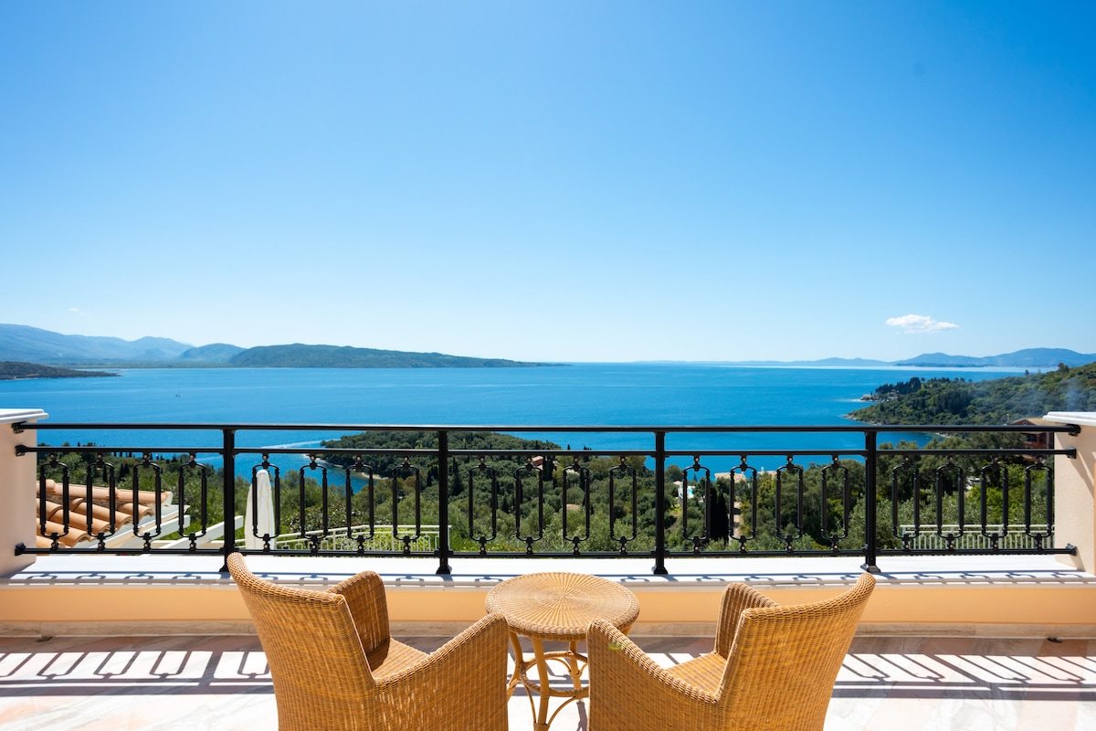 Luksuriøs 2-etagers strandvilla i Bougainville Bay Resort med betagende udsigt over Det Ioniske Hav og Korfu. Det har 2Bdr, komplet bad, stor terrasse kun få meter væk fra havet. Det omfatter privat skødeparkering, italienske granitgulve overalt, designerkøkken, 55" 4K-tv med Netflix og nye møbler. Meter væk fra havet med gratis fiberinternet (WiFi), tøjvask i boligen og rengøring. Adgang til pools, spaer og parasoller på stranden (ekstra gebyr).
