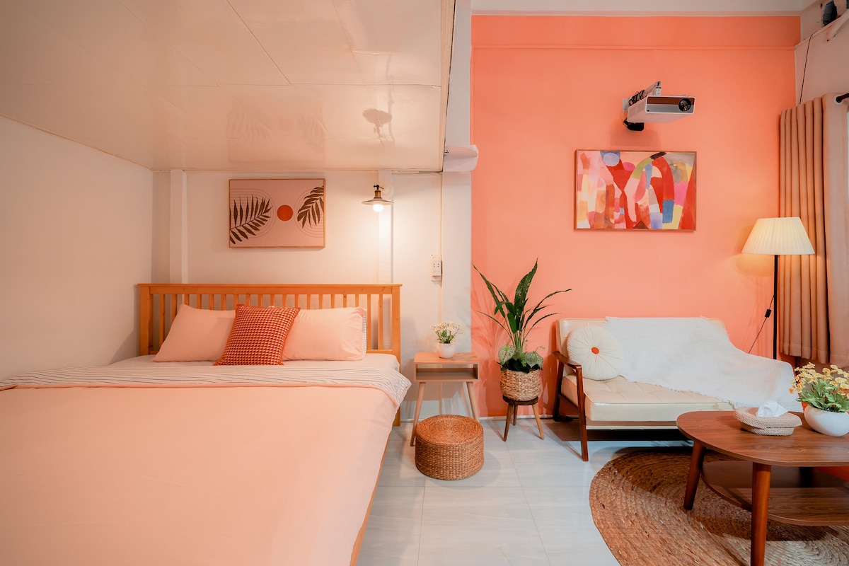 Velkommen til din urbane oase! Slap af i vores 1-værelses lejlighed til 2 med en bred balkon i Japan Town, kun 5 minutter fra HCM centrum. Restauranter, barer, caféer, massagesteder og nærbutikker ligger alle inden for 1-200 meter til fods. På 3. sal har dit Japandi-paradis alle faciliteter. Ingen elevator, men den brede og blide trappe er en gratis træning! 💪 Nyd en 100 tommer projektor til filmaftener, en hyggelig 1,8 m sofa, et fuldt udstyret køkken og et forfriskende badeværelse.