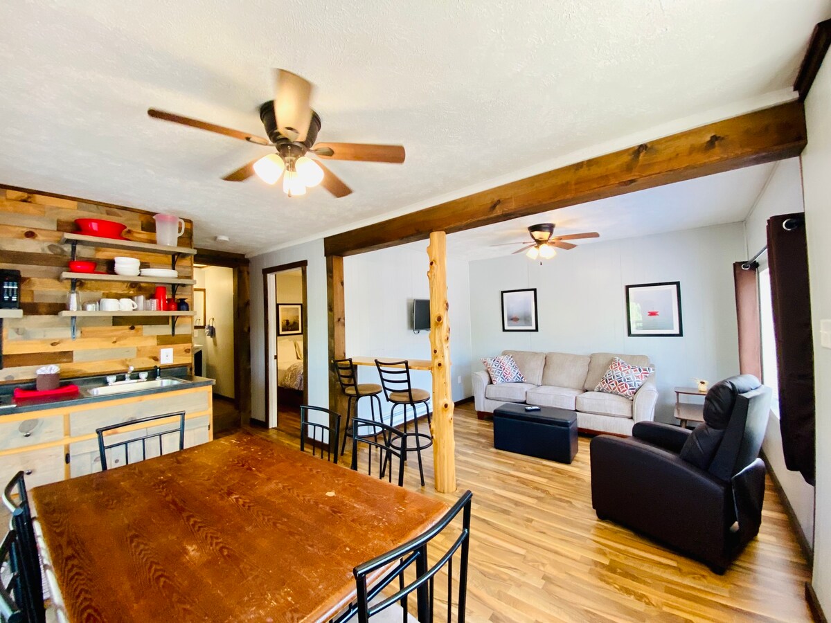 Denne fuldt møblerede lejlighed ligger lige ud til søen og har alt fra sengetøj til service. Boligerne er rustikke og kan dateres tilbage til 60'erne, men med nyere apparater, gulve og meget mere. Udenfor har vi gas- og kulgriller, en central bålplads, hestesko og cornhole! Der er en 6-drevet og overdækket bådbro lige her på Cedar Hollow til din båd, fiskeri og svømning. Vi stræber efter at være dit hjem væk fra hjemmet, dit lykkelige sted! Bed om flere oplysninger.