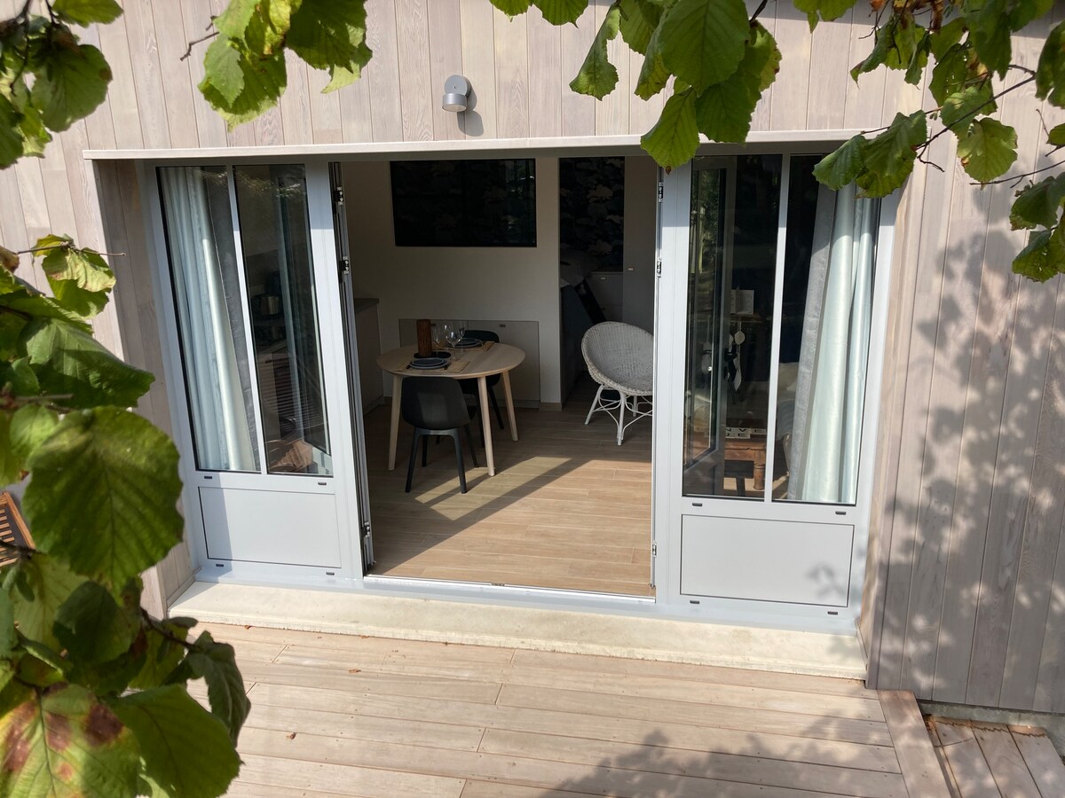 Uafhængig træbolig, beliggende i rolige og grønne omgivelser med udendørs terrasse, godt eksponeret. Fuldt udstyret køkken. Skræddersyet indretning. Ny bolig. I nærheden af Caens bymidte, væddeløbsbanen, messeområdet, slottet. Tæt på mindesmærket. Ideel beliggenhed til at besøge regionen (landsætningsstrande, museer ..) Fantastiske golfbaner