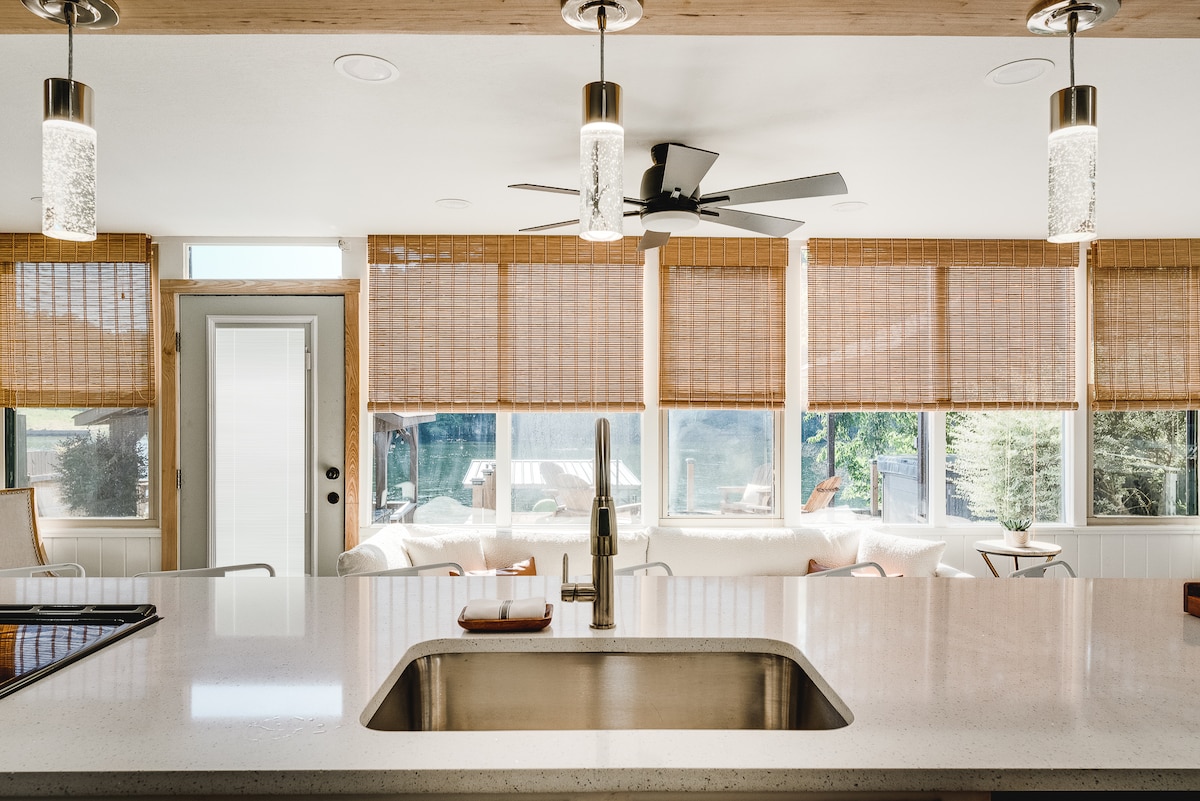 Søfront*spabad i cedertræ * kajak * kano * bålplads * udendørs brusebad * Tesla-universaloplader * grill * afskærmet veranda * Vi har LIGE bygget denne havnefront, "Treetops Hideaway on the Water" til vores pensionisttilværelse; du får lov til at bo her i stedet for os (og vi er jaloux). Den har et komplet luksuskøkken, LG frontlæsser, kingsize senge, original kunst, ejendomsmøbler og faciliteter. Dette er en privat indgang med to senge, to ensuite badeværelser med walk-in brusere og Kohler badekar på 1800 SF.