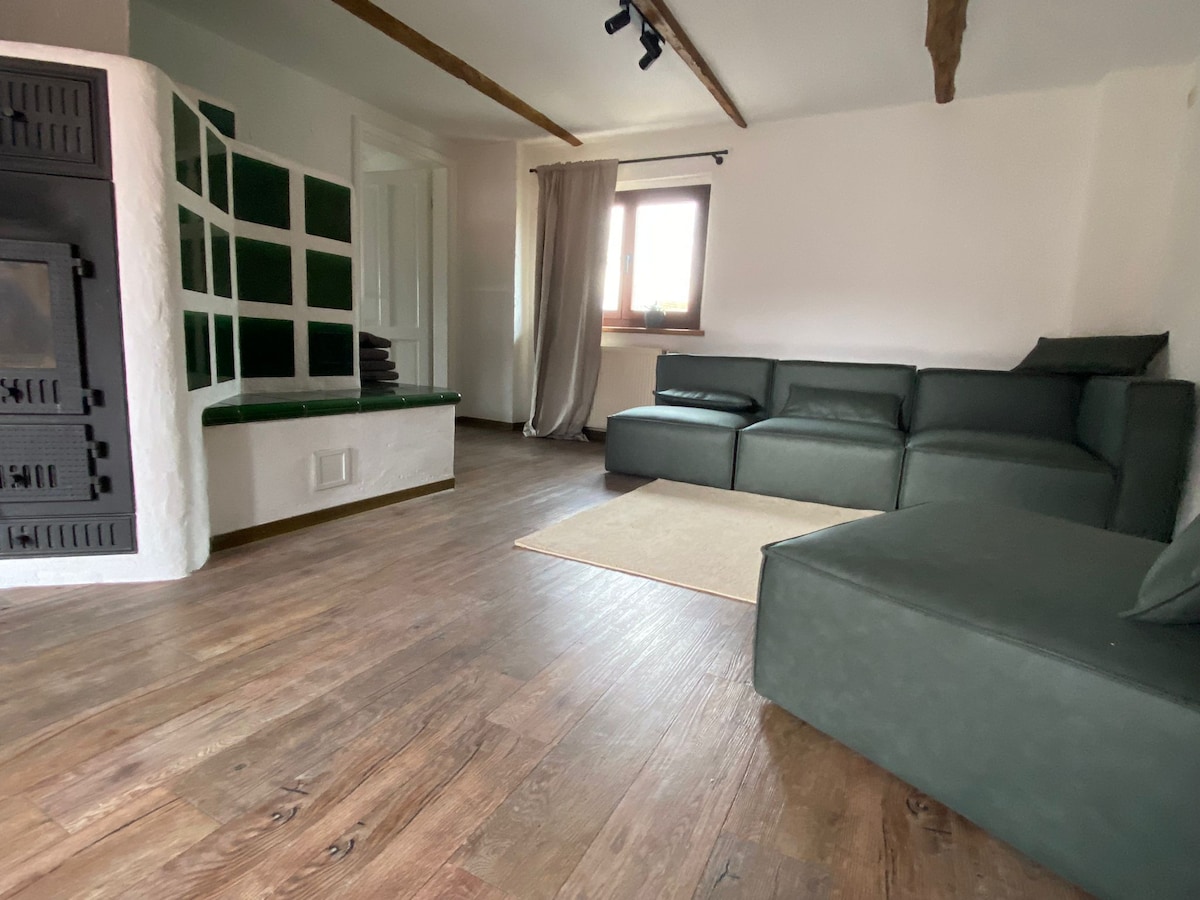 Das Stadteck in Wittichenau bietet Platz für bis zu vier Personen und überzeugt mit warmen Design und selbstgebauten Möbeln. Es gibt 2 Schlafzimmer, jeweils mit handgefertigten Doppelbett aus Holz (auch als Einzelbetten stellbar). Die große Wohnküche überzeugt mit Esstisch und schickem Sofa – ideal für gemeinsame Mahlzeiten. Im modernen Bad mit ebenerdiger Dusche befinden sich Waschmaschine & Trockner für längere Aufenthalte. Gegenüber befindet sich ein Bäcker für frische Brötchen am Morgen.