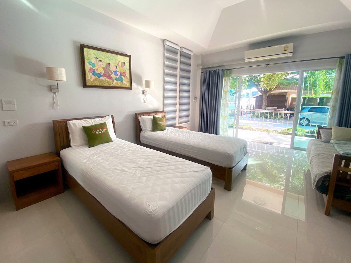 En privat poolvilla – The Sand and I Private Pool Villa, Slap af i en privat villa med 4 soveværelser, 5 badeværelser og pool lige i hjertet af Hua Hin og få skridt til stranden. Nyd en lys stue med et stort tv og streaming på Disney+ og Netflix – perfekt til hyggelige filmaftener efter en dag på stranden eller en runde golf. Hel villa og privat pool – din gruppe har fuld og eksklusiv brug under opholdet.