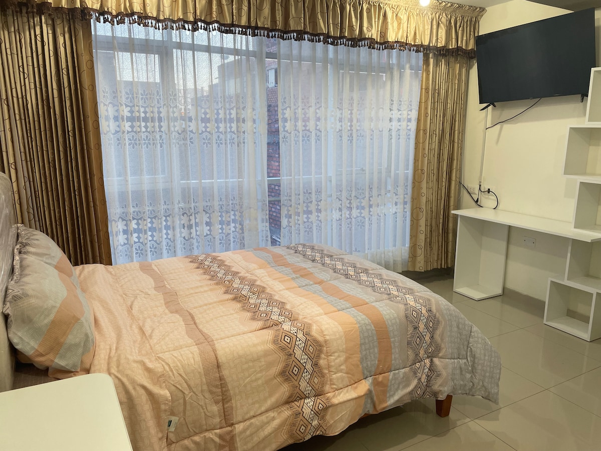 Møbleret værelse med privat badeværelse med udsigt over parken, ideelt til indenlandske og udenlandske turister, rolig og afslappet atmosfære. Tæt på Huanca Identity Park og byens centrum.
