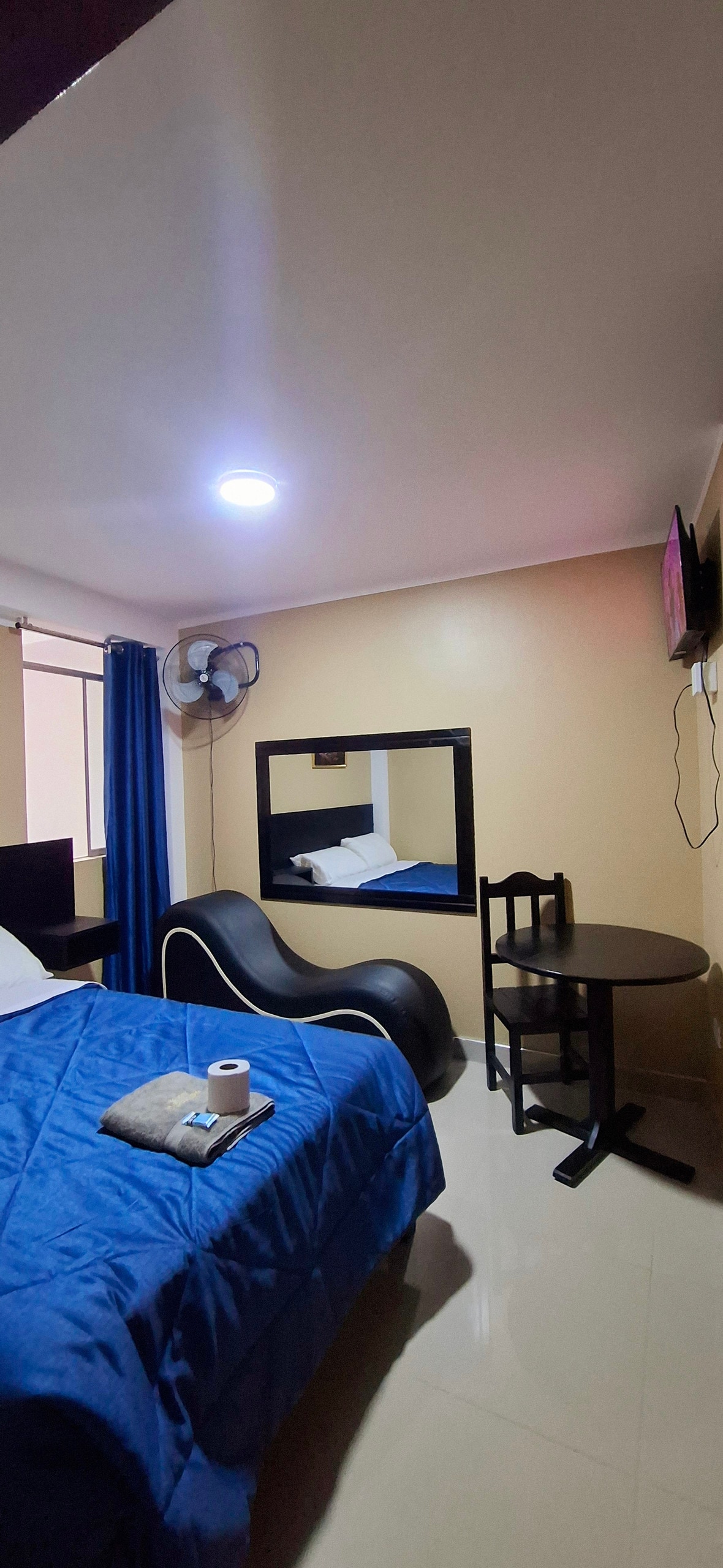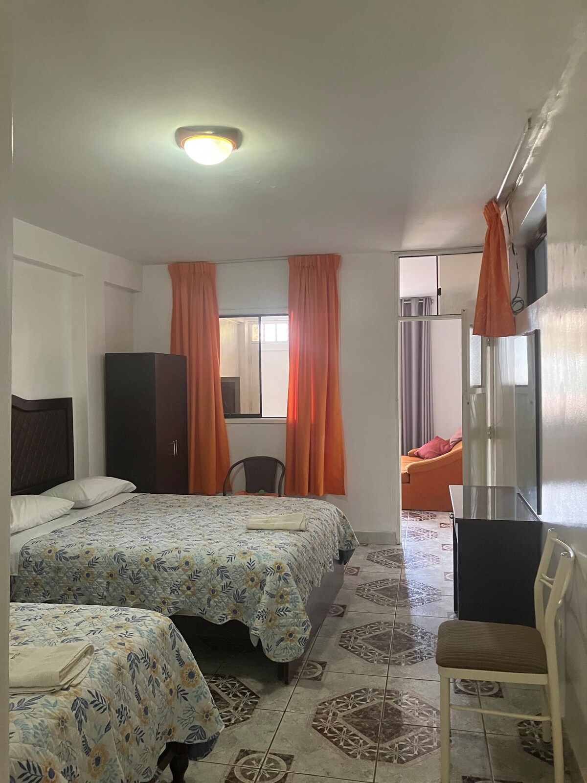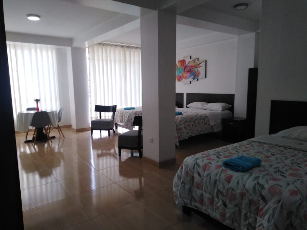 La habitación de la foto, puede tener hasta 3 personas, TV, WiFi, armario y baño privado, las atenciones son las de un hotel. El hotel se estrenó 2021. Es parte de un grupo hotelero con más de 20 años atendiendo familias, empresas y clientes corporativos. Ubicado en un zona residencial muy tranquila cerca al centro y a una cuadra de la avenida principal y 2 cuadras de la Panamericana Norte. Zonas comunes: 2 salas, una terraza con TV y kitchenette para compartir con amigos y una linda vista.