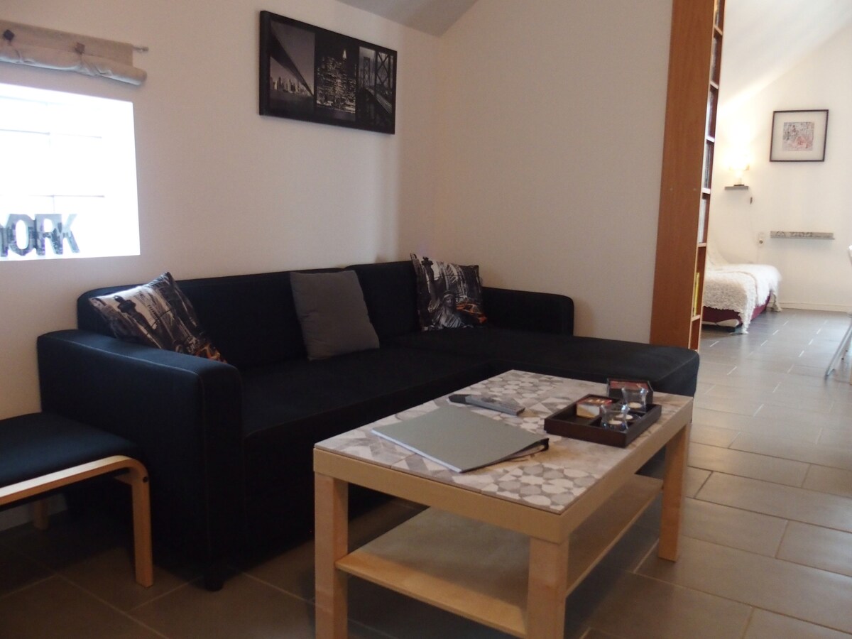 2-værelses lejlighed på 30 m2 i stueetagen: - soveværelse med 1 seng 140 x 200 cm - Stue med en sovesofa - Badeværelse med bruser, toilet - Køkken med opvaskemaskine, ovn, mikrobølgeovn, kedel, kaffemaskine ... I et hus med flere lejligheder i rolige og grønne omgivelser. Sengetøj (sengen skal redes af gæsten) og håndklæder er inkluderet i prisen.