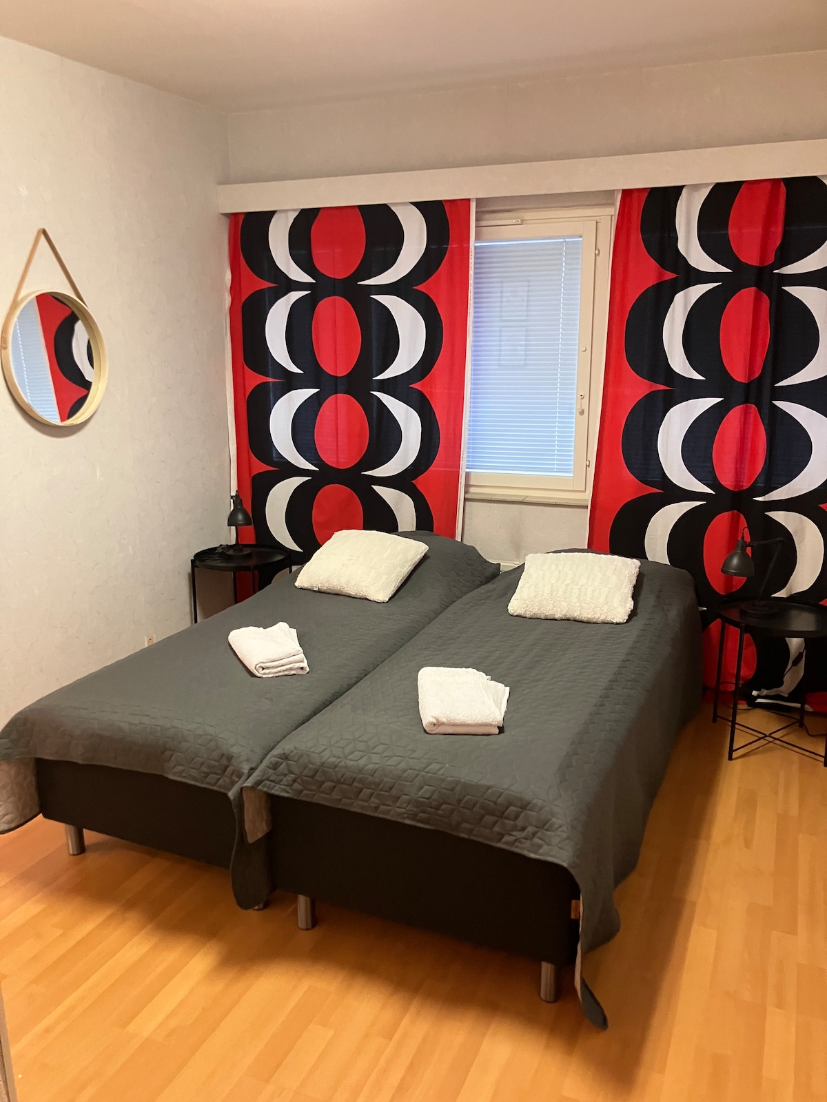 Nyd et hyggeligt ophold i en kompakt 45m² lejlighedsbygning på anden sal i centrum af Seinäjoki. Togstationen ligger kun 500 meter væk, og den nærmeste købmand ligger 350 meter væk. Sengetøj og håndklæder venter altid på dig og er inkluderet i lejen. Seks sovepladser: en dobbeltseng, en sovesofa og en bred luftmadras. Lejligheden har en kølemaskine og mørklægningsvinduesdækning i soveværelset. Du har også adgang til gratis parkering for en bil.