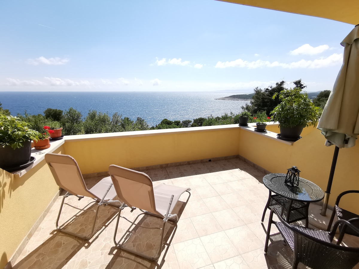 Unik beliggenhed, da du bor i et område med enestående naturlig skønhed. Min bolig er omgivet af natur. Dit værelse har en virkelig fantastisk panoramaudsigt over havet, som giver dig mulighed for virkelig at slappe af, det er airconditioneret og meget privat med en stor terrasse. Min have har et udsigtspunkt til solnedgangen, der er uovertruffent i Hvar. Det er højst 20 minutters gang til det livlige bycentrum, hvor det meste af gåturen er langs kysten. Ved indtjekning vil jeg give dig masser af oplysninger, så du virkelig kan få mest muligt ud af din tid i Hvar