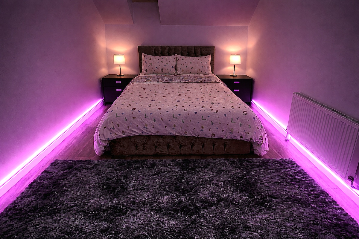 Charmerende moderne soveværelse i kælder med dobbeltseng og eget badeværelse
