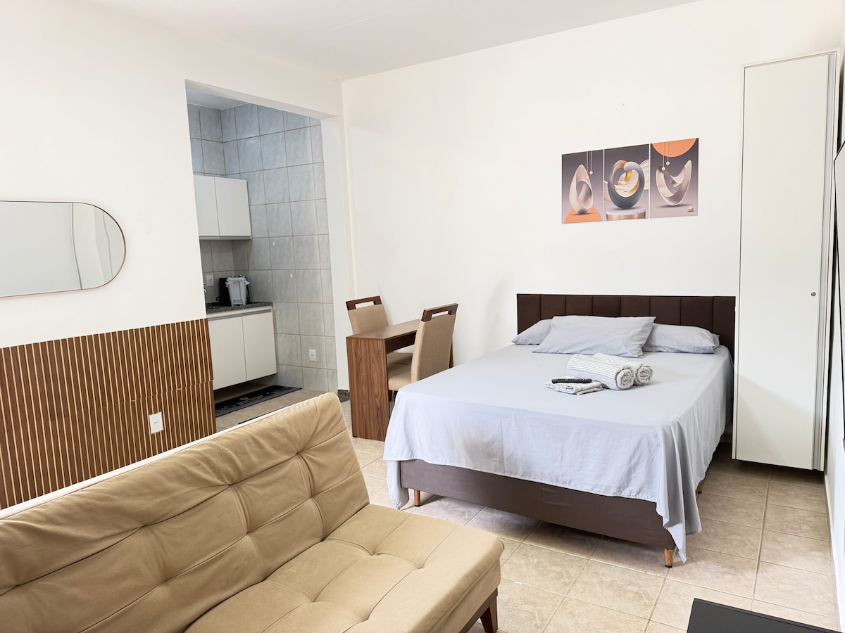 Moderne lejlighed, 32 m2, beliggende på det bedste sted i Sion. Praktisk køkken med minibar, kogeplade, tv (åbne kanaler/Netflix), aircondition, hårtørrer, elkedel og internet. Sydzonen, ved siden af Praça JK og Avenida Bandeirantes, foran et supermarked. Bygningens tagterrasse har fitnessrum, sauna, swimmingpool, opholdsområde og fælles køkken (vand, ismaskine). Rengøring tilgængelig efter behov. Sikker bygning med dørmand døgnet rundt. *Garage er ikke inkluderet.