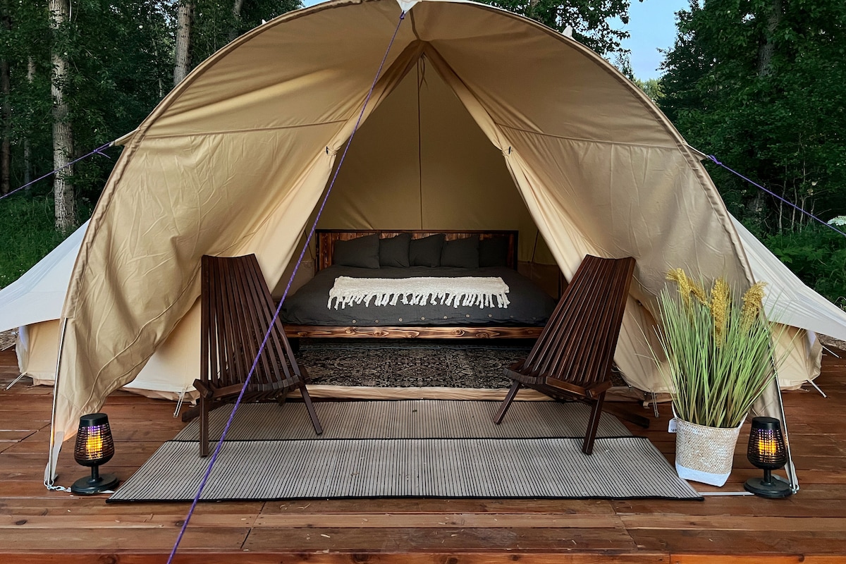 Enjoy the lovely setting of this romantic spot in nature. Escape to our luxurious glamping tent, nestled on 40 acres of serene forested land. Experience the perfect blend of nature and comfort. After a day of exploring the trails, unwind in our hot tub or indulge in a sauna session. Enjoy the sounds of nature as you relax under a starlit sky. Seekers of adventure or tranquility, our glamping tent offers a unique getaway that revitalizes your spirit and reconnects you with the great outdoors.