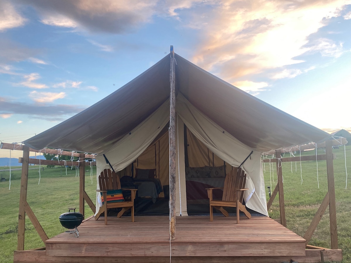 Enjoy the best view on the planet from the deck of your 12 x 17 Montana Canvas tent which sits on a raised wooden platform, made from locally milled pine. You will have everything you need to enjoy your stay. Electric lights and heater, plug in for phone or laptop, Wifi (sometimes signal varies), Fire Pit and wood, Propane burners, well water through RV hose, and covered compost style toilet. Outdoor shower w/ warm water supplied by an on-demand water heater.