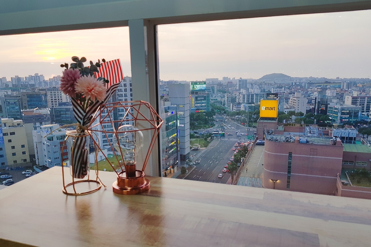 Pura vida: "rent liv", "glædeligt og lykkeligt liv" Følelsesmæssig indkvartering 10 minutter fra lufthavnen, hvor du kan nyde den spektakulære havudsigt over Jeju. Der er en "dagligvarebutik" og "Daiso" inden for et minuts gang, så jeg tror, det vil være meget praktisk. Du kan opbevare din bagage når som helst, så du bedes rejse bekvemt ~ Føj sjov til din rejse med Smart TV, Netflix, YouTube med mere ** Lige foran boligen er der en promenade, hvor du kan gå en tur med dine kære, elsker og din hund:) Enkel madlavning er mulig ~ Vis dine madlavningsfærdigheder frem til din elsker og familie Der tilbydes gratis tøjvask og tørring i Puravida.