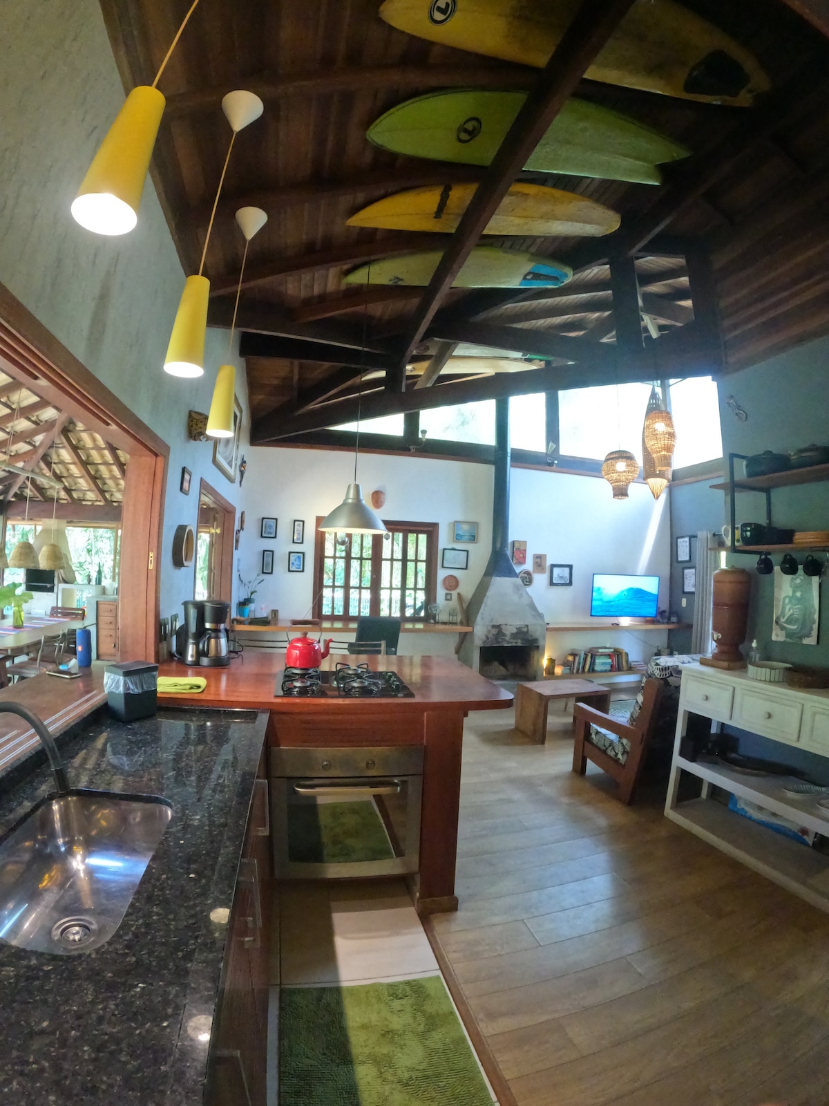 Huset er integreret i skoven, i trætoppene, med udsigt over havet, inde i ejendomsforeningen, på højdedraget i højre hjørne af Praia do Félix, i den smukkeste og bedst bevarede del af Ubatuba kommune. Her vågner du op til lyden af den atlantiske skov og bølgerne. Der er 3 suiter, hængekøjer, sofaer, TV med DVD, hurtigt internet og grill. Dette er det perfekte hus for dem, der ønsker at nyde fred og natur, med al verdens ro.
