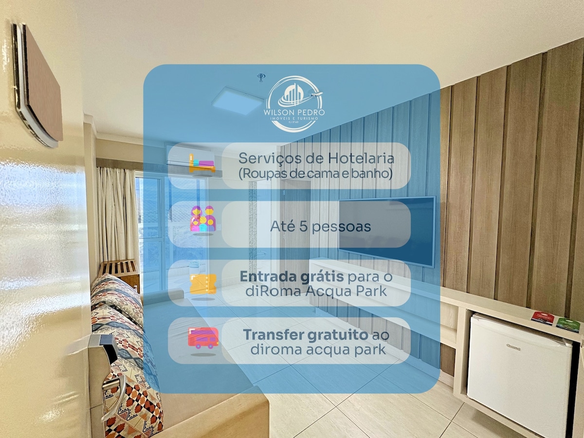 Stuelejlighed i Lacqua Diroma 3🤩☀️💦 Gebyr på 10,00 BRL per person for adgangsarmbåndet til vandlandet Lacqua Diroma (Jardins Acqua Park-24hs, det på billederne i annoncen, FORAN Lacqua Diroma). Du betaler kun 1 gang. Op til 5 personer. (Børn i ALLE ALDRE tæller som en person) Komplet lejlighed med udstyret køkken, queensize seng i soveværelset, dobbeltseng i stuen og enkel madras til den femte gæst. Sengetøj håndklæder er ikke inkluderet. 30 % rabat på billetten til diRoma splash💦