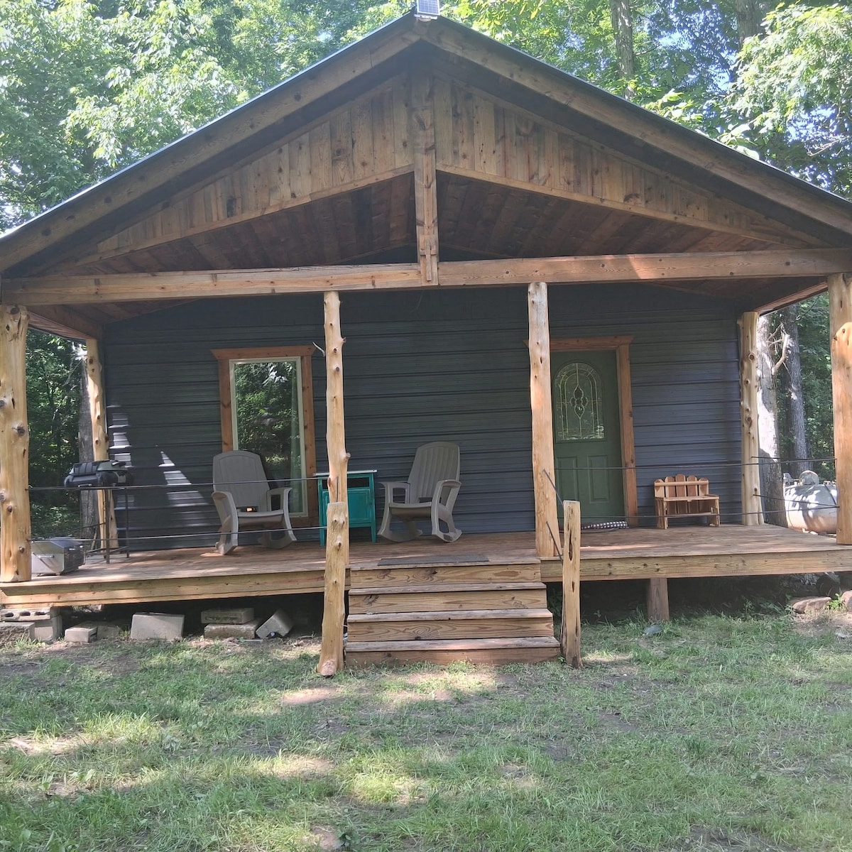 Cozy secluded cabin with wood burning fireplace.