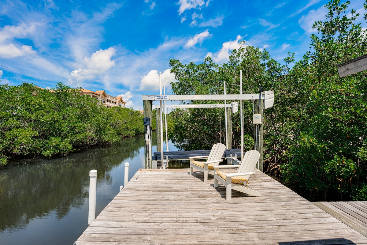 Velkommen til Villa Azule, dit luksuriøse fristed for Indian Rocks Beach! - Rummeligt tilflugtssted ved vandet på 2.646 kvadratmeter med fantastisk udsigt over kanalen. – To store soveværelser med kingsize-dobbeltsenge og et soveværelse med queensize-dobbeltseng, der kan rumme op til 10 gæster. - Udendørs faciliteter omfatter en bådlift, propangrill, bålsted, cykler og kajakker. - Åbn et opholdsområde, der er perfekt til afslapning og underholdning. - Tæt på lokale butikker og 10 minutters gang til stranden. - Gratis mousserende vin venter på dig.