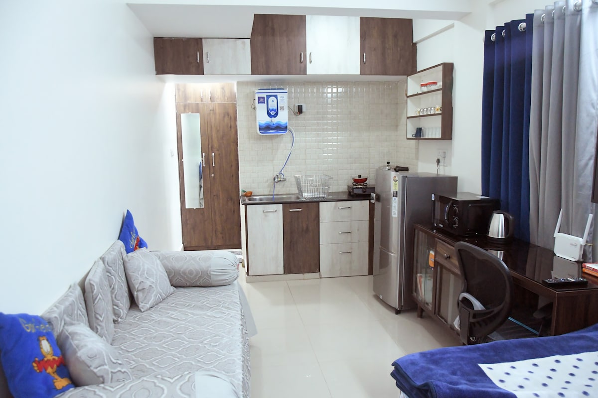 Experience our brand new, premium Studio Room, ideal for couples and travellers seeking comfort and privacy in a convenient location. The bedroom has a king bed with soft orthopedic mattress for a restful night's sleep. Features an Air Conditioner, 43-inch Smart TV, lightning-fast WiFi, and a dedicated work desk. Comes attached with a super clean bathroom that’s stocked with bath essentials. The building is equipped with a lift, security guard, 24-hour power backup and CCTV surveillance.
