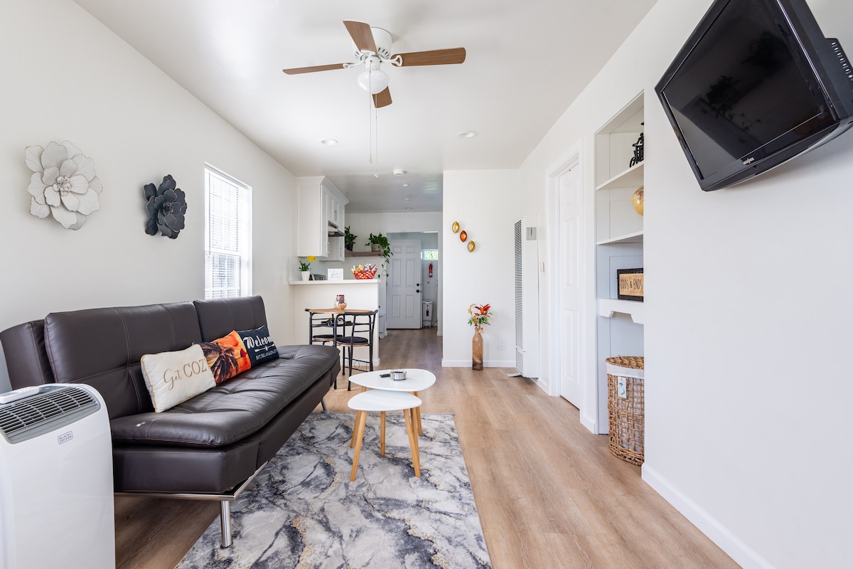 Et fredfyldt skjulested. Sikkert, charmerende, 1 nyrenoveret gæstehus med 1 soveværelse i det beboede Kentwood-område i Westchester. Enkel gadeparkering. Gåafstand til LMU, supermarkeder og faciliteter i nabolaget. 10 minutters kørsel til LAX, Playa Del Rey Beach og SOFI. Kør nordpå langs kysten til MDR, Venice, Malibu. Åbent planløsning med stue/køkken med alle faciliteter. Opholdsrummet åbner ud til et privat udendørs siddeområde. Udendørs udsigt fra soveværelset. Fælles spiseområde til 6/grill.
