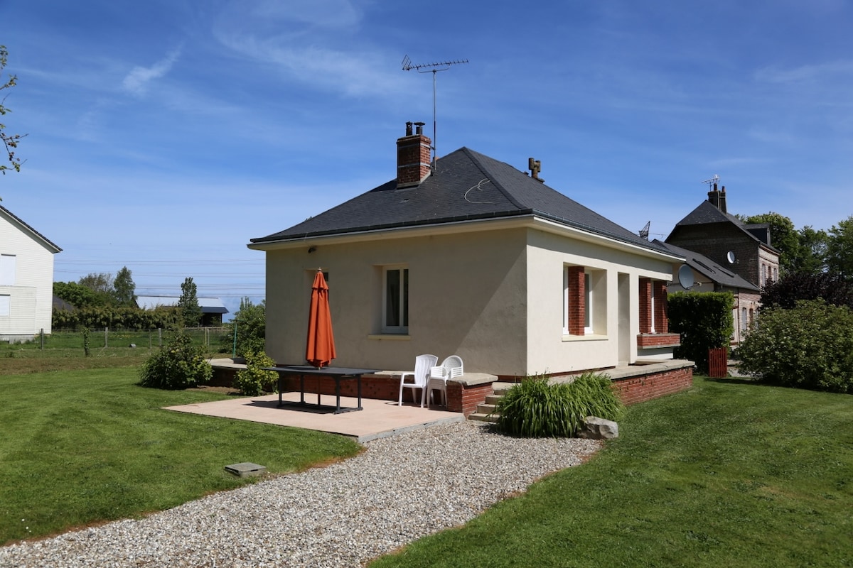 Vi tilbyder en rolig bolig på landet, med en stor grund; beliggende lige ved siden af Saint Valery en Caux. Huset er fra 50'erne, og er blevet renoveret og møbleret med omhu. Den har to soveværelser med en dobbeltseng og en sovesofa i stuen. Omgivrigheden er behagelig, da den vender ud mod en eng med æbletræer og får. Indhegnet grund. Smukke besøg og aktiviteter i nærheden: Veules les roses, Etretat, Dieppe, golf, træklatring ...