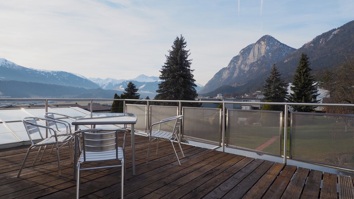 Huset Sunnseitn ligger på solens side af Innsbruck med en vidunderlig panoramaudsigt. Lejligheden på øverste etage med 2 store værelser og en pejs til knitrende aftener, samt en ekstra vinterhave venter på dig. Terrassen har en åben udsigt over de omkringliggende bjergtoppe. Vi bor på nederste etage og ser frem til dit ophold. Hvis du ønsker det, kan vores søn give dig tips om forskellige aktiviteter.