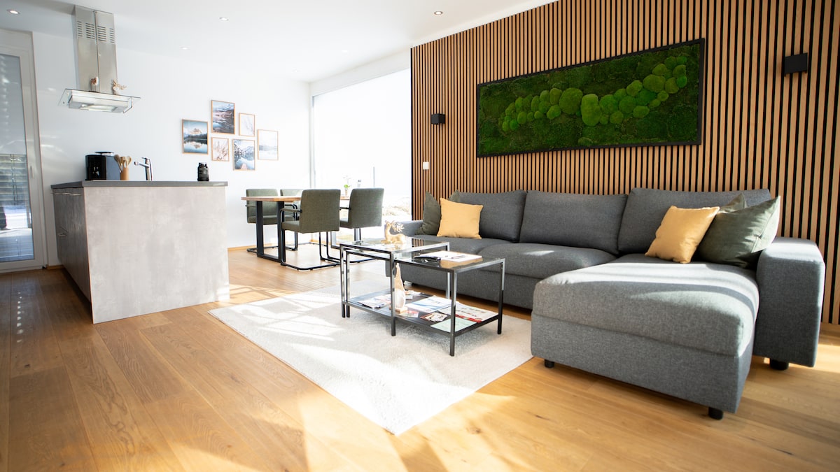 rolig beliggenhed og betagende udsigt over naturen Nyd fred og frihed. Lad dig fortrylle af den uhindrede udsigt over markerne ind i de omkringliggende bjerge. Du vil slappe af, lade op og nyde din ferie fuldt ud. Vores 50 kvm lyse, oversvømmede terrassesuite har en dobbeltseng i kingsize-størrelse, en sovesofa, et fladskærm-tv med Apple-tv, spiseplads og et fuldt udstyret, meget rummeligt køkken.