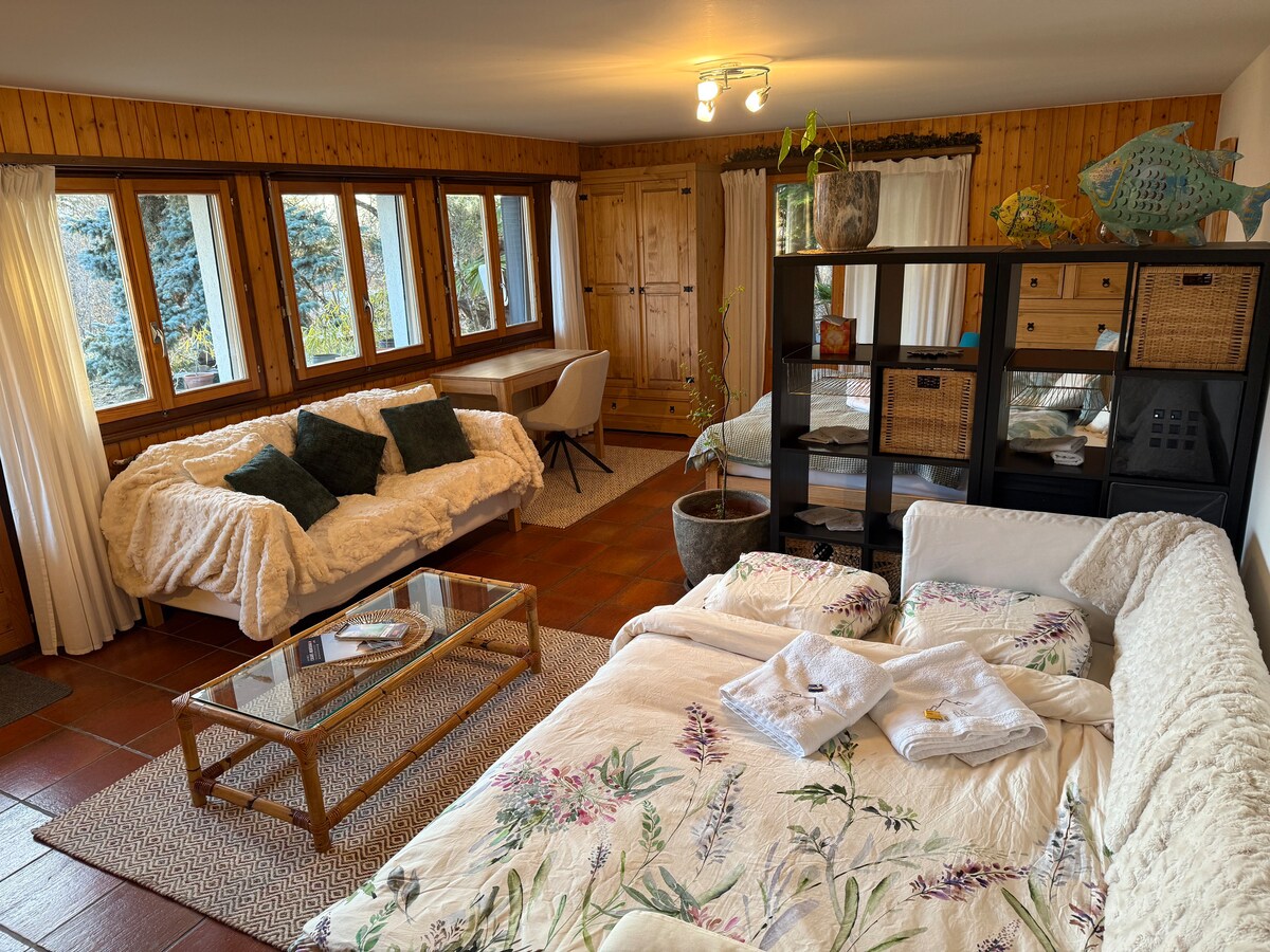Du bor i en lille fin barokhytte. Luzernes centrum ligger inden for 10 minutters gang. Hytten er ideel til 1-2 personer. Miniværelset (samlet areal 14 m²) har alle de detaljer, der gør dit ophold hyggeligt og behageligt. Der er en behagelig sovesofa, som du bruger som sofa i løbet af dagen. Du har et udendørs område med bord, stole, lænestole og liggestole. Der er også en brandring til rådighed. Bag huset begynder en smuk skov til vandreture.