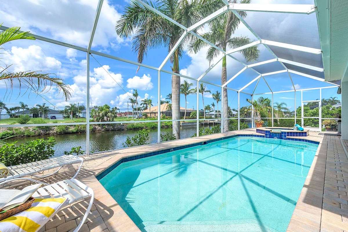 EN AF DE BEDSTE HAVFRONTER I CAPE CORAL! En kort gåtur til stranden. Dette hjem på 2.500+ kvadratmeter har fantastiske solnedgange og sydvestlig udsigt over vandet fra alle de vigtigste opholdsområder samt Master Suite. Opvarmet pool med LED-farvet belysning, indbygget spa, poolbad, komplet vaskerifacilitet, Lanai, pejs, Wi-Fi og TV i hvert soveværelse, privat kaj. Båd på lift til leje med RPM-udlejning. Stor garage til 2 biler med 5 cykler, strandvogn og køler på stedet.