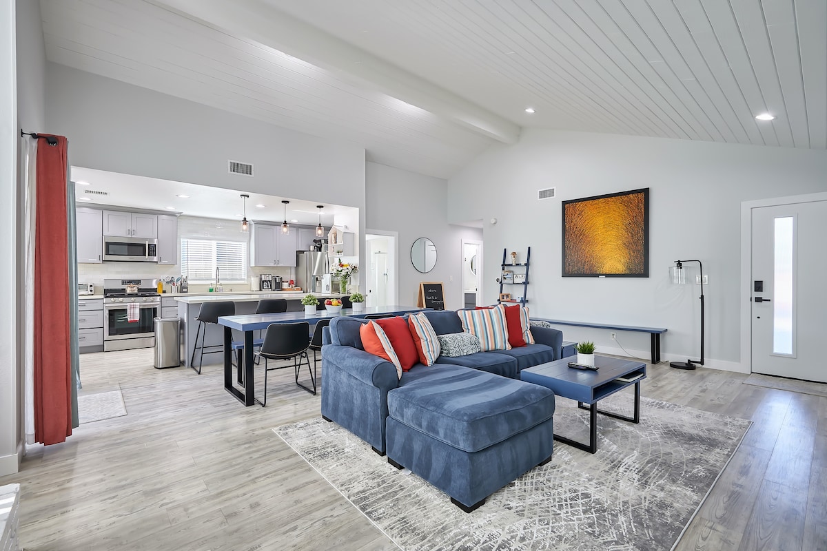 Slap af og træk dig tilbage i dette moderne hjem i mid-century-modern-stil med tre soveværelser og to badeværelser beliggende i et fredeligt nabolag tæt på masser af shopping, spisesteder og et eventcenter. Dette hus har en åben planløsning, højt loft, en lysende pool, der skifter farve, og rummelige værelser. Udenfor kan du tage en dukkert i den store småstenspool. Der er også et udendørs brusebad, hvor du kan skylle dig af, slappe af på den solrige terrasse eller nyde økologiske citroner fra citrontræet. Tag en gåtur, tag på picnic, eller spil tennis i parken, der ligger lige overfor.