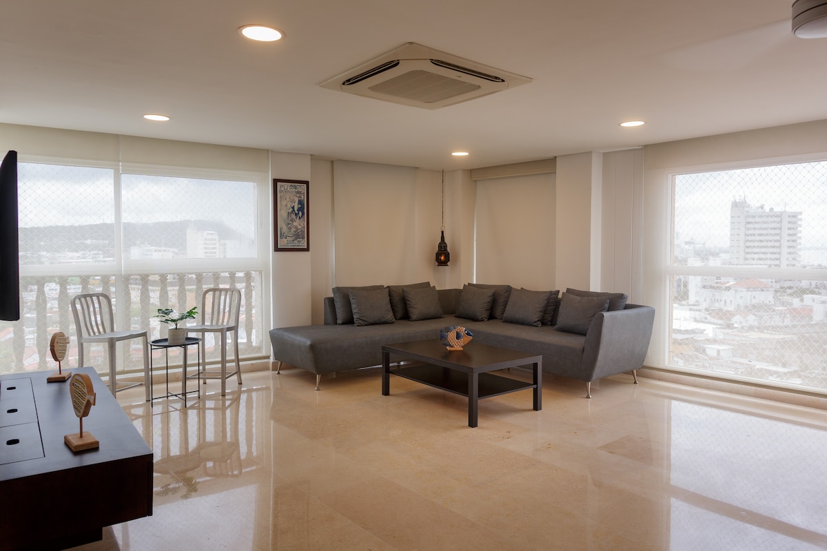 ✨ Velkommen til dit fristed i Cartagena: en luksuslejlighed på en af de øverste etager med udsigt over havet, to private balkoner og 180° panoramaudsigt over Caribien og bugten. Den er designet med henblik på din komfort og har en moderne stue med vinduer fra gulv til loft, et fuldt udstyret køkken, hurtig wi-fi og digital indtjekning. Nyd infinitypoolen, baren ved poolen og fitnessrummet med havudsigt. Beliggende i Bocagrande, få skridt fra stranden og få minutter fra Walled City. 🌊🌴