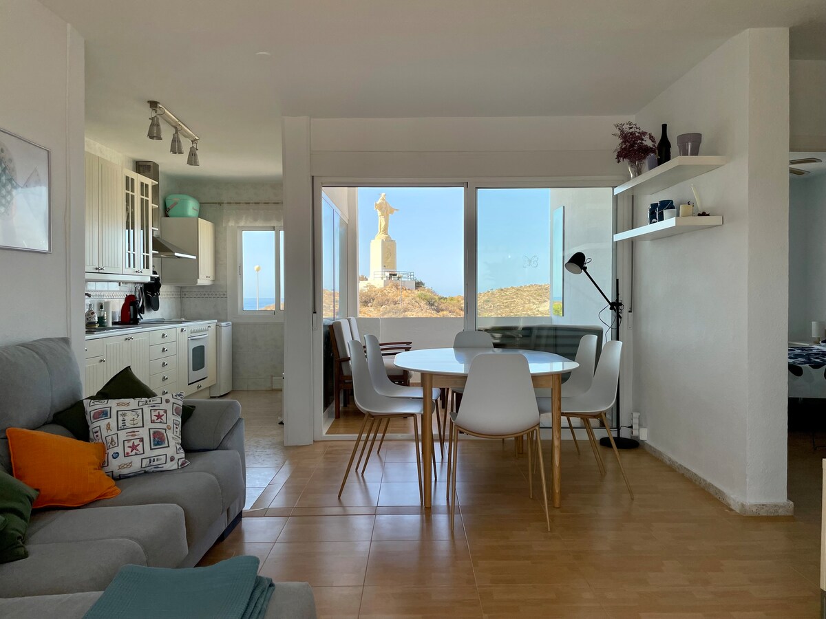 Acogedor apartamento con 2 dormitorios en la zona del Faro del Puerto de Mazarrón, está situado en lo alto del Monte frente al Cristo del Sagrado Corazón de Jesús y goza de unas vistas estupendas de la playa y del atardecer desde una terraza. Perfecto para desconectar en invierno y disfrutar en verano en una urbanización con piscina comunitaria con vistas al Puerto, aparcamiento privado, WIFI, ropa de cama, toallas, menaje de cocina, y todo lo necesario para que os sintais como en casa.