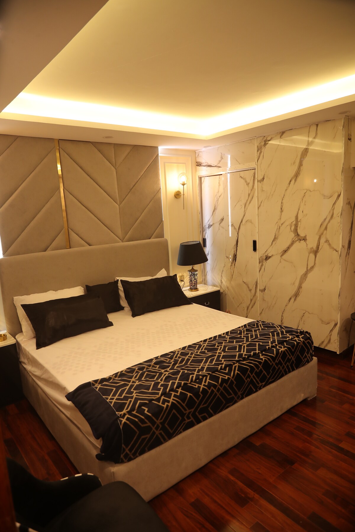 Træd ind i Moonlight by fior, hvor moderne luksus møder en fredfyldt atmosfære. Denne elegant designede lejlighed har et rummeligt opholdsområde med elegant indretning, der fremhæves af en fantastisk måneinspireret væglampe, der skaber en beroligende glød. Det åbne layout omfatter en hyggelig stue, stilfuld indretning og moderne underholdning. Denne bolig er perfekt til afslapning og tilbyder både komfort og raffinement, så du får et uforglemmeligt ophold.