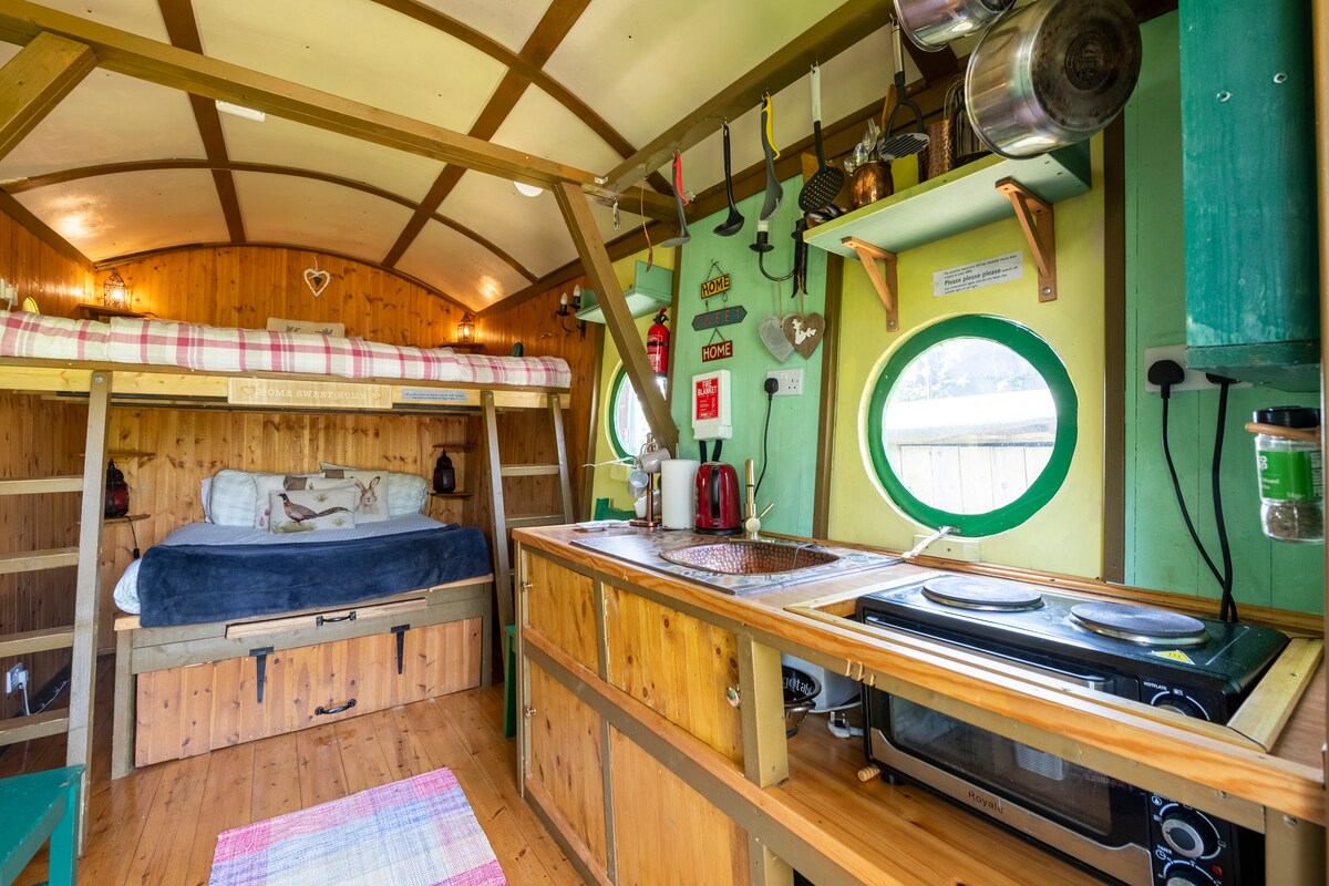 Bluebell er en kærligt ombygget klassisk Mercedes 814 hestevogn i egetræ. Nyd et fredfyldt ophold på vores eng med vilde blomster. Hyggelig brændeovn indenfor, eller sid omkring bålet udenfor. Der er solenergi og USB-stik, men ingen strøm eller wi-fi. Bruseren og komposttoilettet ligger i nærheden. Vi leverer en køleboks med teposer, frisk kaffe, olie, eddike, salt og peber. 15 minutter fra Zipworld. Gå eller cykle lige ind i bjergene. Gårdbutik og café 20 minutters gang gennem marker og skove.