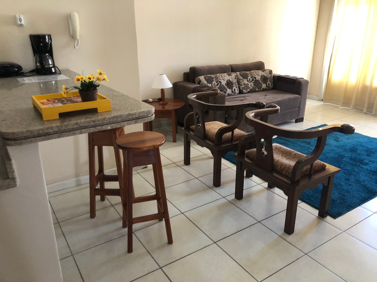 Tranquility near the sea! This fully equipped apartment blends contemporary design with a privileged location. It features a climatized suite with a double bed and a well-equipped kitchen, an integrated living room with sofa and TV, and a balcony overlooking nature that enhances the stay. The building includes a swimming pool and easy access to beaches, markets and local services. Book now and experience Ilhéus.