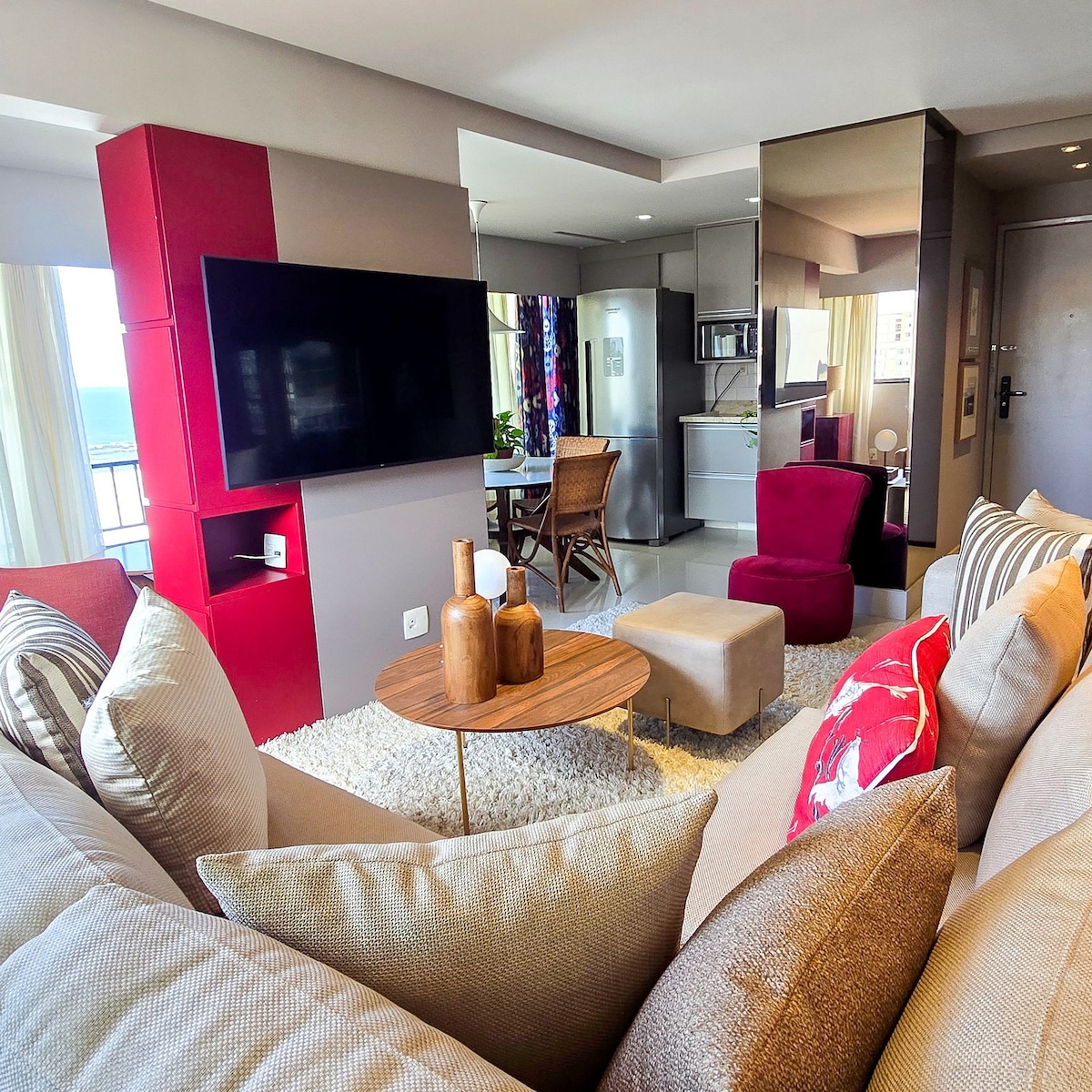 Komfortabel, moderne og fint indrettet lejlighed i den helt nye bygning 535 Barra med en smuk udsigt over Praia do Farol da Barra. Lejligheden har delt aircondition i alle værelser, 50" smart-tv, 500 Mb wi-fi (optisk fiber), vaskemaskine og tørretumbler, swimmingpool, fitnessrum og privat parkering. Central og privilegeret beliggenhed, tæt på det travle natteliv i Barra og et par meter fra de dejlige naturlige pools og det vigtigste turiststed – Farol da Barra.