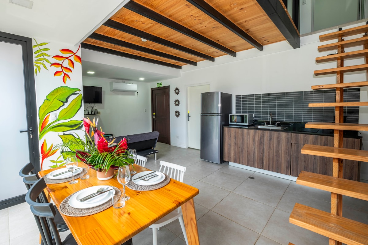 Velkommen til den tropiske oase ved stranden! Denne bolig ligger i Macaws Ocean Club - et lejlighedskompleks med flere boliger med pool og sikkerhed døgnet rundt - men selve boligen er utrolig unik. Fjernet fra alt og omgivet af træer, føles det helt privat. Nyd et komplet køkken, et stort badeværelse og en privat terrasse, der omslutter hele boligen. Tag den tropiske vandresti til stranden på mindre end et minut! Beliggende i hjertet af Jaco, men væk fra al støjen.