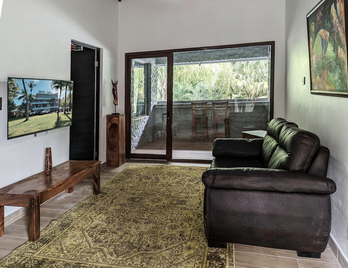 Helt ombygget i oktober 2022. Trip Advisor Hotel of the Year Jaco 2022. Suite #8 er en 395sf poolside suite på anden sal med en stue, soveværelse med kingsize seng og bad. Alt er nyt, fra madrasserne til airconditionanlægget til møblerne. Du har også en privat terrasse. Du kan gå til alt. Du behøver ikke at have en bil. Der er intet mellem dig og havet, undtagen sand. Læs omtalerne. Du har fundet det bedste sted i hele Jaco.