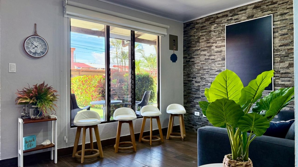 Velkommen til den tropiske oase ved stranden! Denne bolig ligger i Macaws Ocean Club - et lejlighedskompleks med flere boliger med pool og sikkerhed døgnet rundt - men selve boligen er utrolig unik. Fjernet fra alt og omgivet af træer, føles det helt privat. Nyd et komplet køkken, et stort badeværelse og en privat terrasse, der omslutter hele boligen. Tag den tropiske vandresti til stranden på mindre end et minut! Beliggende i hjertet af Jaco, men væk fra al støjen.