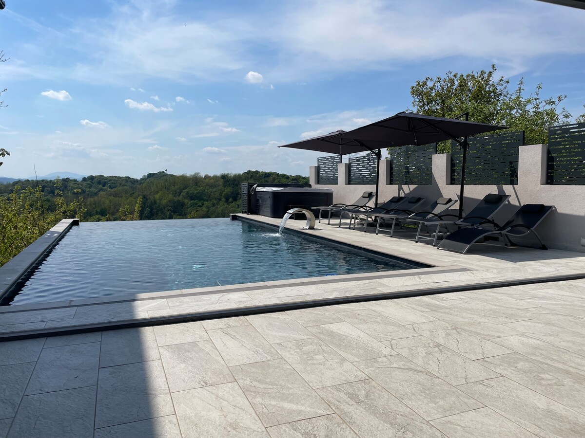 Velkommen til en rolig bolig med fantastisk udsigt og privatliv. Nyd den indendørs jacuzzi, eller slap af i saunaen, der er perfekt til afslapning. Huset har terrasser med udsigt, hvor du kan slappe af i fred. Vi tilbyder også opladning af elbiler (giv os besked inden ankomst). Alle genstande er designet til at gøre dit ophold så behageligt og særligt som muligt. Vi opkræver et tillæg på 10 € pr. brug for opladning af biler, hvilket giver os mulighed for at opretholde en høj kvalitet af tjenester.