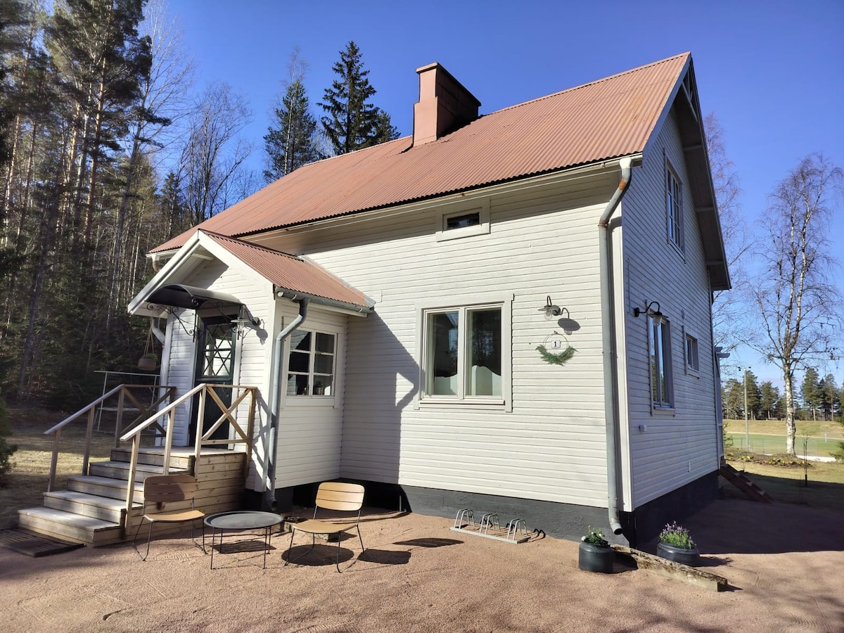 Et renoveret træhus beliggende i et fantastisk skovlandskab, hvor stemningen i det gamle hus er bevaret uden at gå på kompromis med komfort. I stueetagen er der stue, køkken, sauna, toilet, bruser og et husholdningsområde, hvorfra der er adgang til terrassen med grill og bordgrupper. På øverste etage er der to soveværelser, begge med sovepladser til to. Baghaven åbner op til en sportsbane med skiløjper, frisbee golfbaner, hockeybaner, fodboldbaner og udendørs træningsområder. Badestranden ligger en kilometer væk.